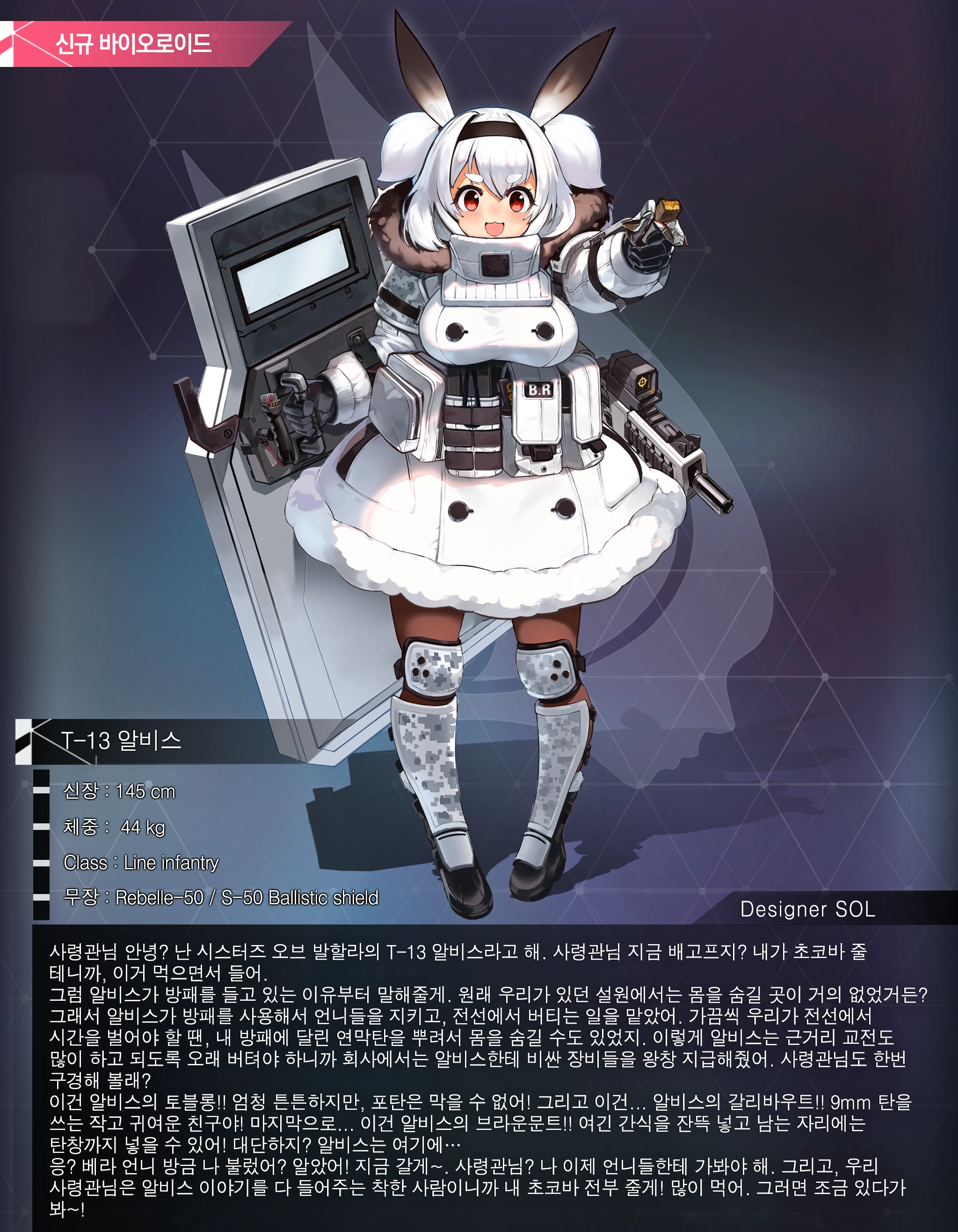 "Hi, commander. I'm T-13 Alvis from the Sisters of Valhalla. You look hungry. Here, have a chocolate bar while I introduce myself.