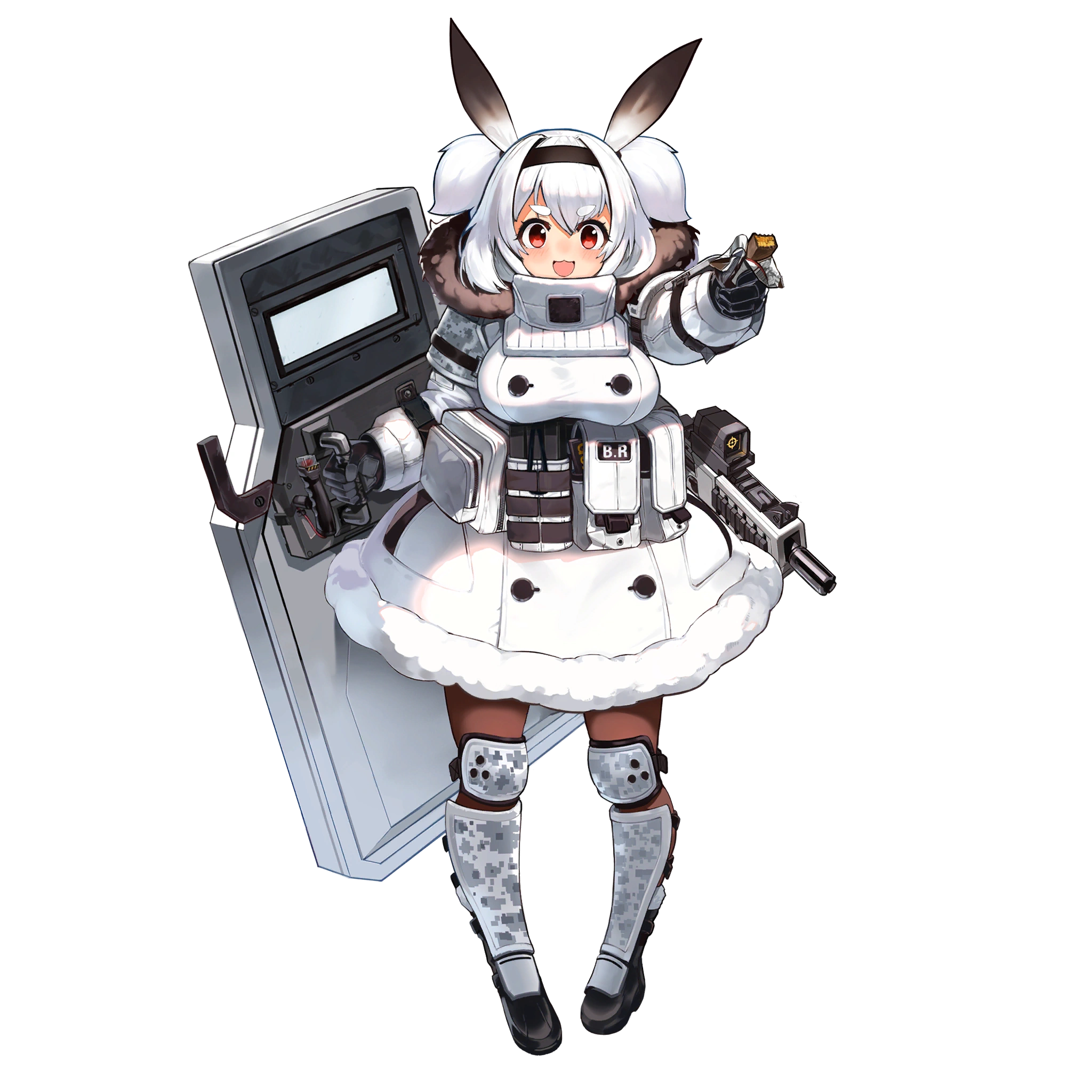 Then let me start with why Alvis carries a shield. You see, there was barely any cover available in the snow-covered fields we used to be stationed in. So Alvis took the role of protecting her bigger sisters with her shield and holding out on the frontline. Sometimes, when we needed to stall for time, we would put up smokescreens built into our shields. As you can see, Alvis engaged in lots of close range battles and needed to stall for as long as possible, so the company issued tons of expensive equipment to Alvis. Wanna have a look, commander?